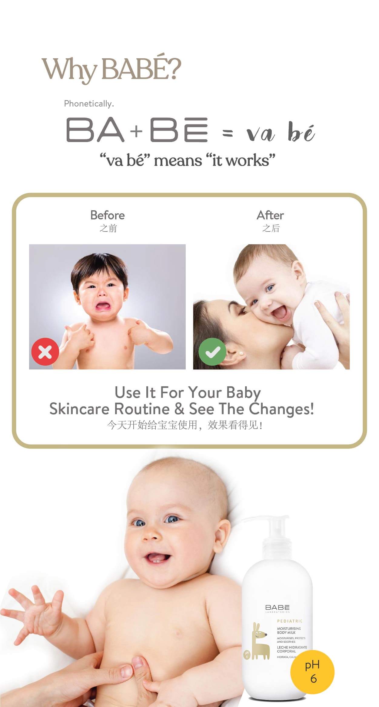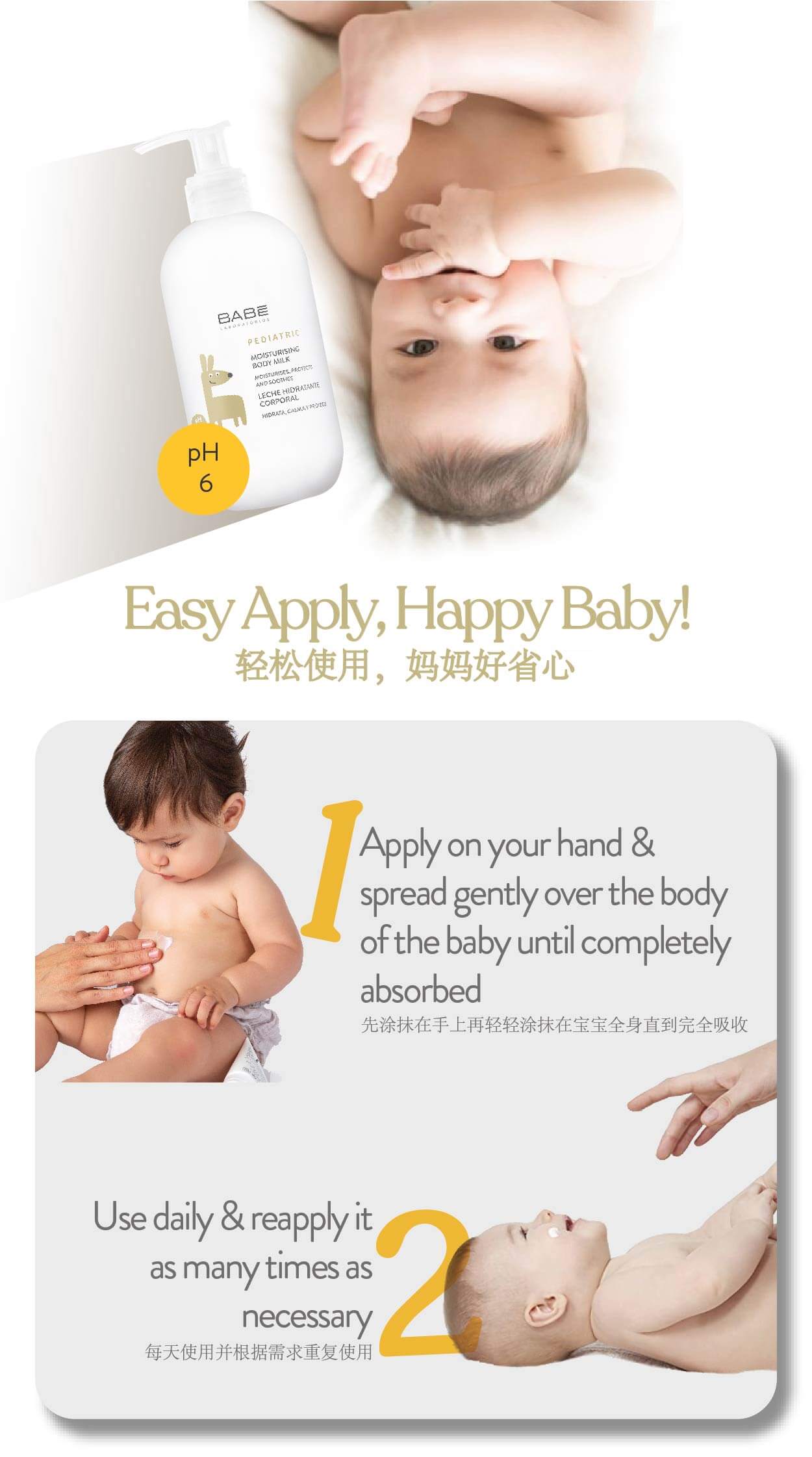 Apply Babe Pediatric Moisturizing Body Milk to the baby’s skin after cleansing and drying. Massage gently until the product absorbs.