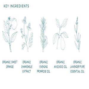 Water (Aqua), Decyl Glucoside, Disodium Cocoamphodipropionate, Cocamidopropyl Betaine, Glycerin, Guar Hydroxypropyltrimonium Chloride, Lactic Acid, Hydrolyzed Wheat Protein, Panthenol, Chamomilla Recutita (Matricaria) Extract*, Persea Gratissima (Avocado) Oil*, Oenothera Biennis (Evening Primrose) Oil*, Allantoin , Sodium Hydroxymethylglycinate, Phenoxyethanol, Citrus Aurantium Dulcis (Orange) Oil*, Lavandula Angustifolia (Lavender) Oil*, Lavandula Hybrida (Lavandin) Oil*, Anthemis Nobilis Flower (Chamomile) Oil* , Lavandula Angustifolia (Lavender) Oil