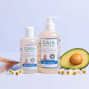 Wet their heads a little using your hand, a small cup or a cloth, making sure water doesn’t trickle down the face. Take a pea-sized amount of GAIA Natural Baby Shampoo and gently lather it into their hair. Don’t rub vigorously!